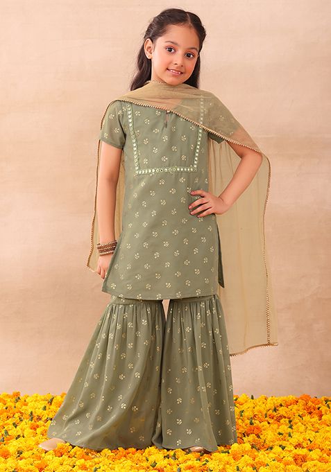 Light Green Foil Print Sharara With Kurta And Dupatta (Set of 3)