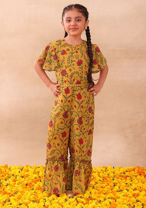 Mustard Yellow Floral Print Jumpsuit With Dori Belt (Set of 2)