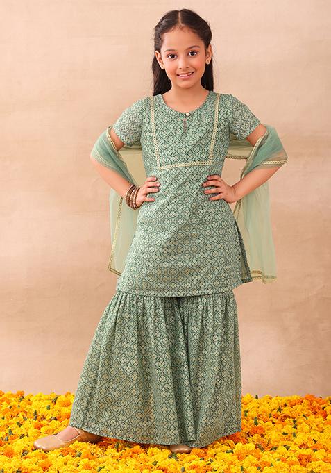 Light Green Sharara With Kurta And Dupatta (Set of 3)