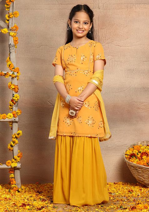 Mustard Abstract Print Kurta With Palazzo And Dupatta (Set of 3)