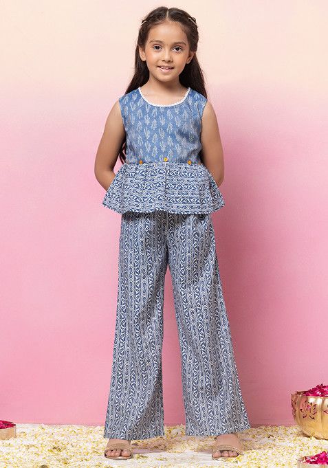 Indigo Blue Block Print Crop Top And Pants (Set of 2)