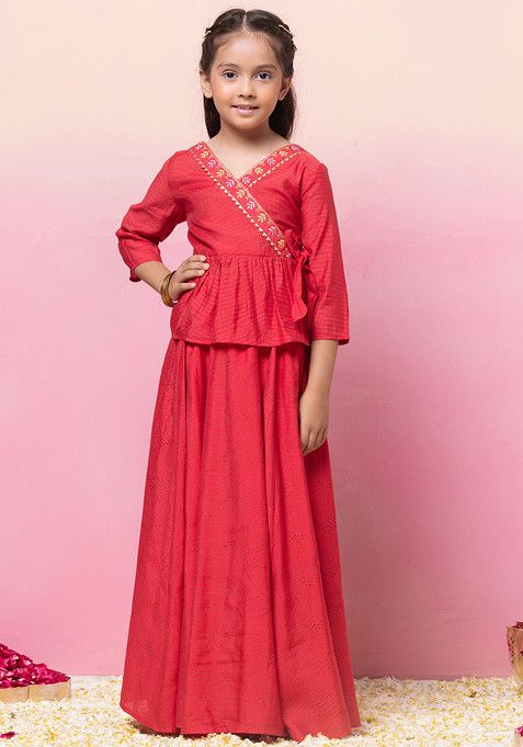 Dark Pink Lehenga With Embroidered Blouse And Mesh Dupatta (Set of 3)