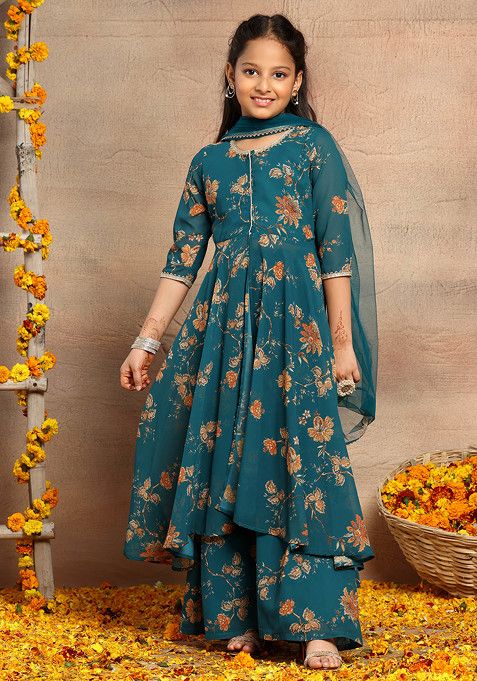 Green Floral Print Kurta With Pants And Dupatta (Set of 3)