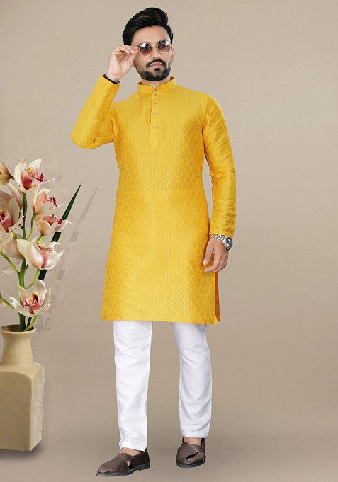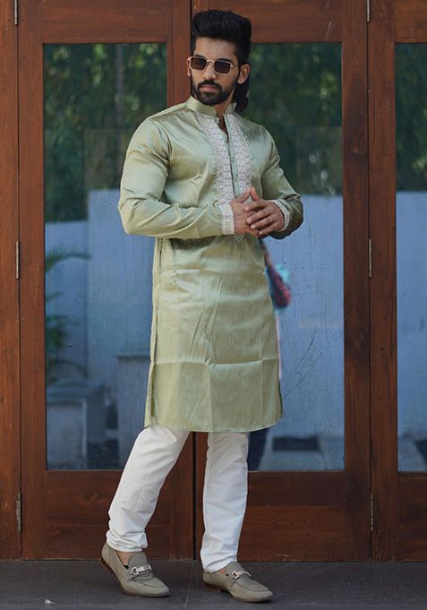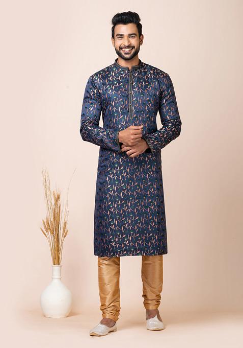 Blue Embroidered Cotton Blend Kurta Set For Men
