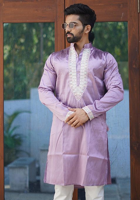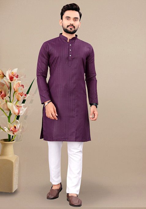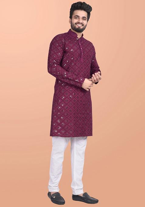 Wine Embroidered Cotton Blend Kurta Set For Men