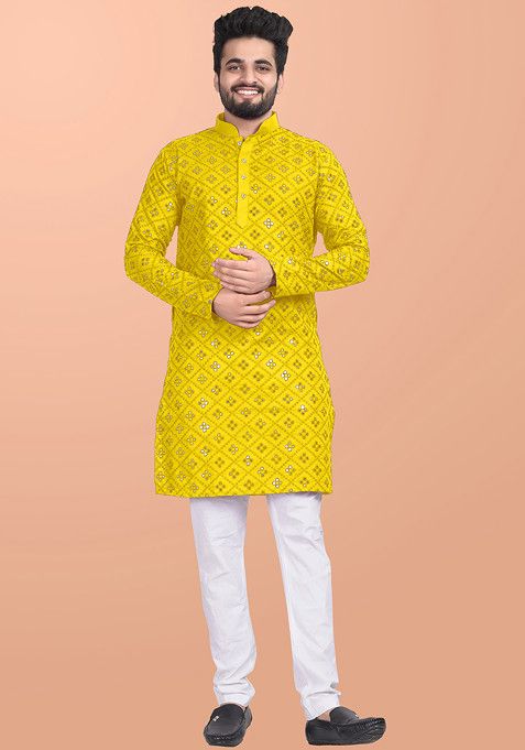 Yellow Embroidered Cotton Blend Kurta Set For Men