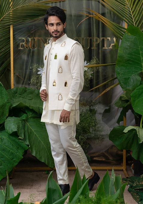 Ivory Hand Embroidered Pure Cotton Kurta Set For Men