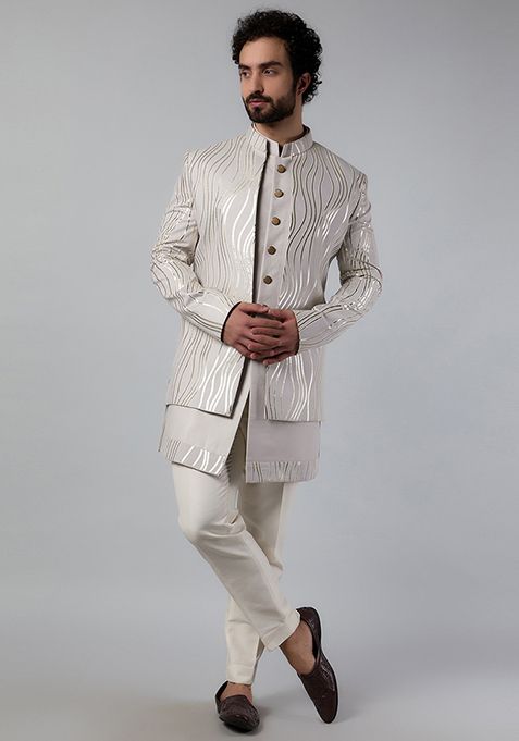 Grey Embroidered Open Jacket And Kurta Set For Men