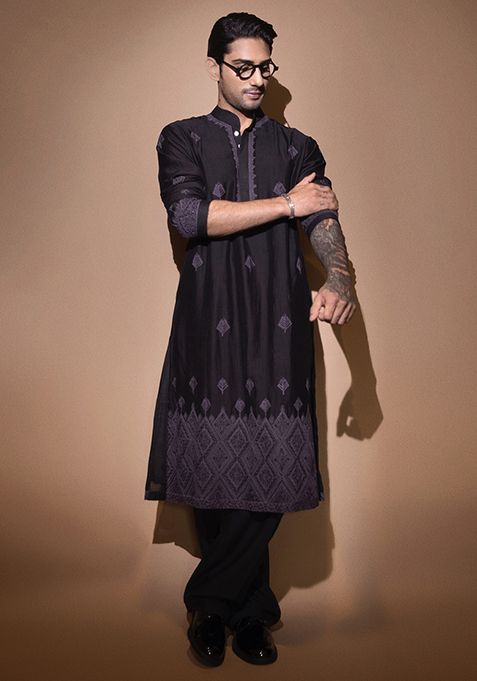 Black Dori Embroidered Chanderi Kurta Set For Men