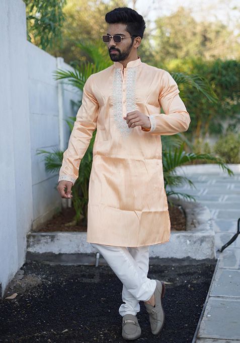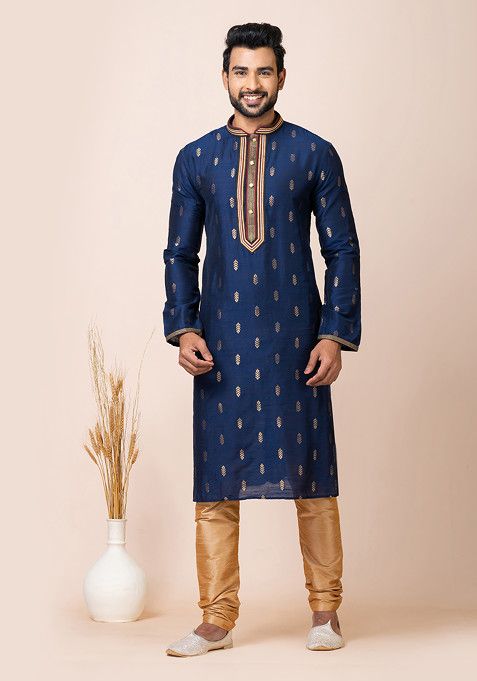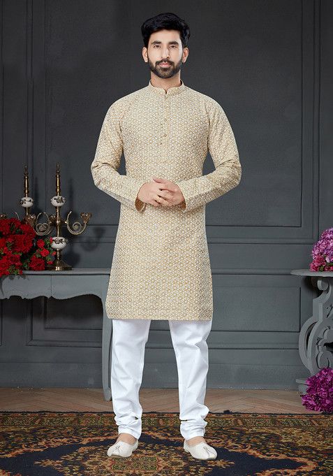 Golden Embroidered Cotton Art Silk Kurta Set For Men