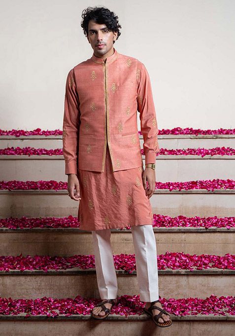 Rust Cheeku Embroidered Bundi Jacket And Kurta For Men