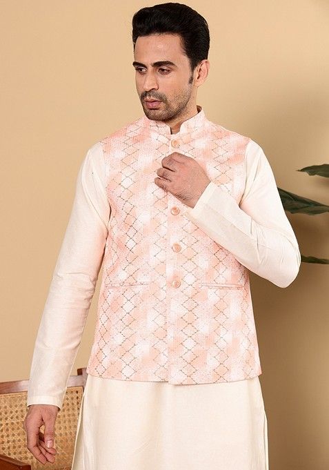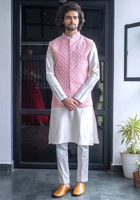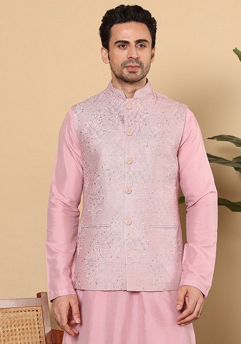 Pink Embellished Viscose Dupion Silk Nehru Jacket