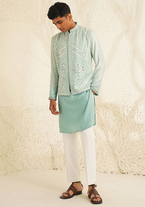 Teal Blue Sequin Embroidered Jacket And Kurta Set For Men