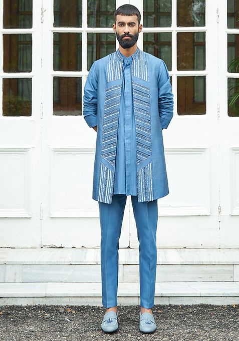 Linear Blue Embroidered Open Jacket With Kurta Set For Men
