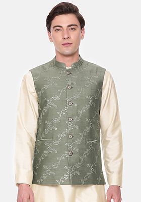 Green Floral Embroidered Chanderi Nehru Jacket For Men