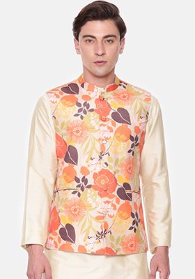 Orange And Beige Floral Print Muslin Nehru Jacket For Men
