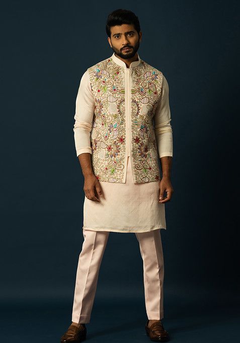 Peach Embroidered Viscose Silk Nehru Jacket And Kurta Set