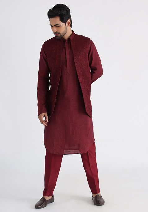 Maroon Hand Embroidered Linen Satin Nehru Jacket For Men