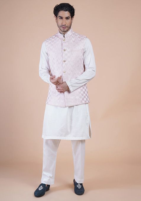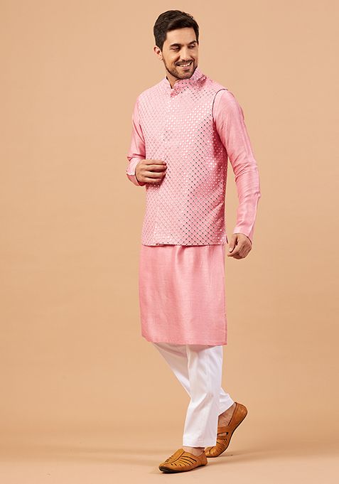 Pink Pinoret Embroidered Nehru Jacket Set For Men