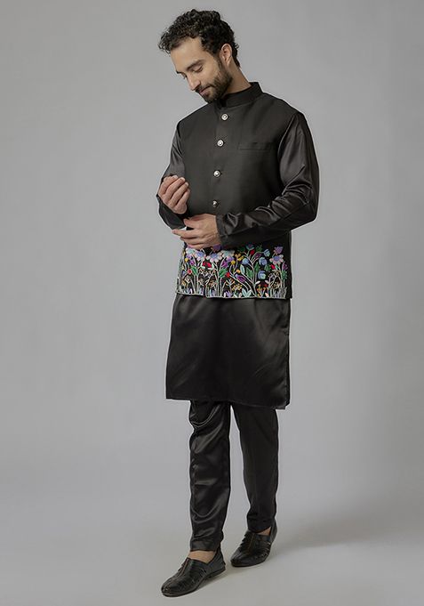 Black Thread Embroidered Cotton Satin Bundi Jacket And Kurta Set For Men