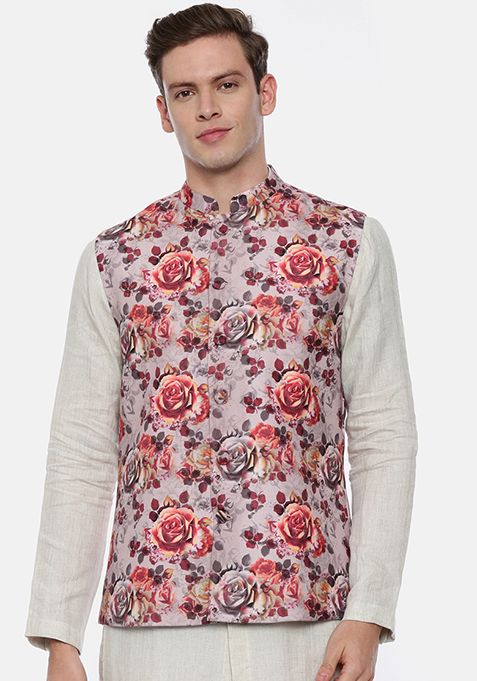 Pink Floral Print Linen Nehru Jacket For Men