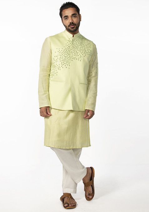 Mint Green Abstract Mirror Work Bundi Jacket And Kurta Set For Men