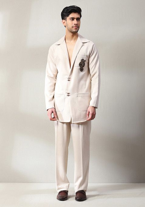 Ivory Embroidered Suede Velvet Blazer Set For Men