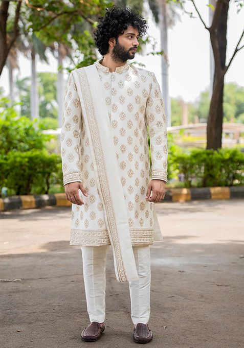 Elysian Silver Zardozi Embroidered Sherwani Set For Men