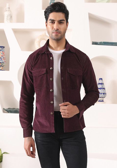 Wine Corduroy Overshirt With Patch Pocket For Men