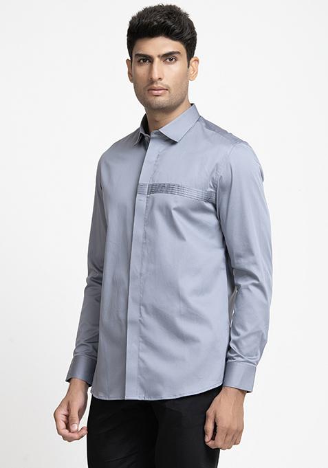Grey Pintuck Embroidered Giza Cotton Shirt For Men