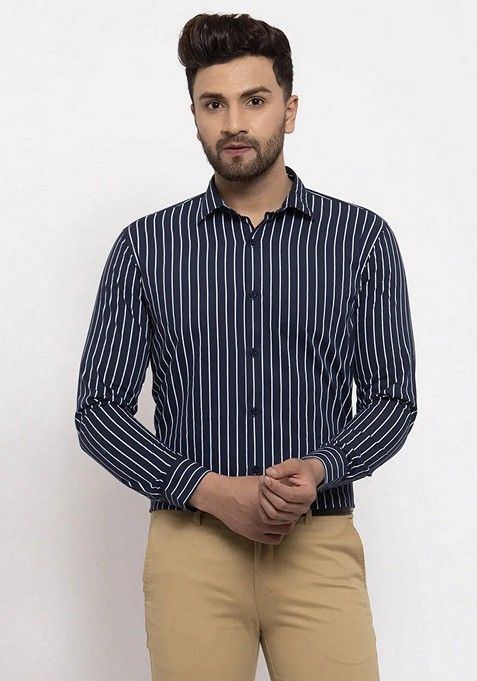 Navy Blue Printed Cotton Shirt For Men