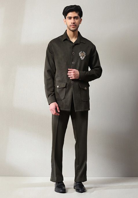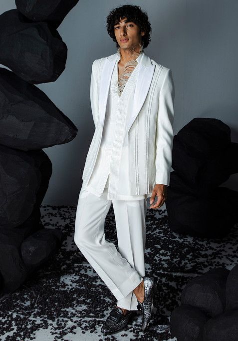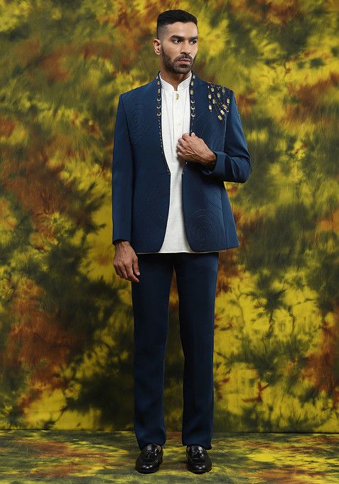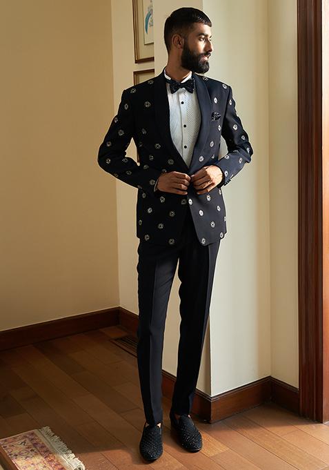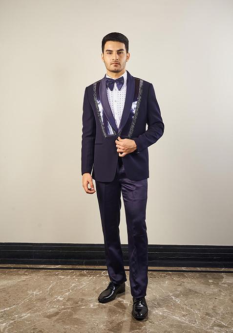 Midnight Blue Embroidered Italian Crepe Tuxedo For Men