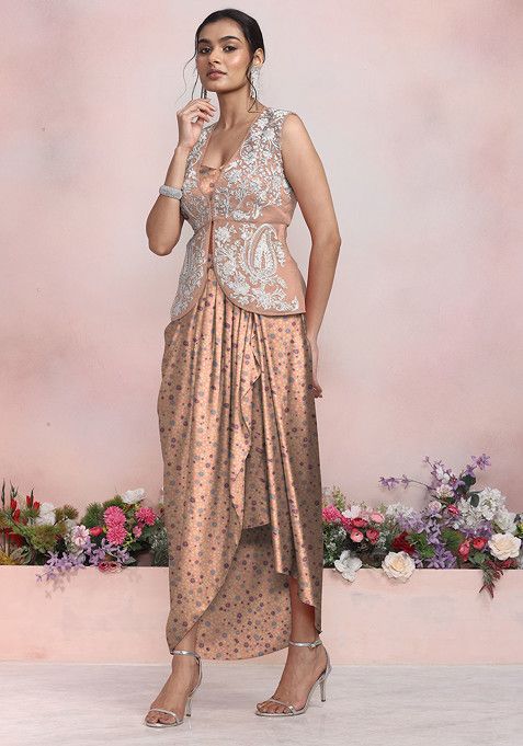 Peach Sequin Pearl Hand Embroidered Jacket Set With Satin Blouse And Skirt