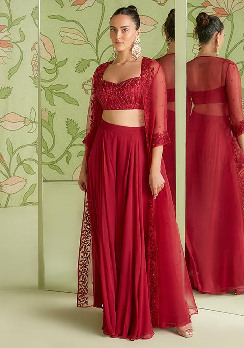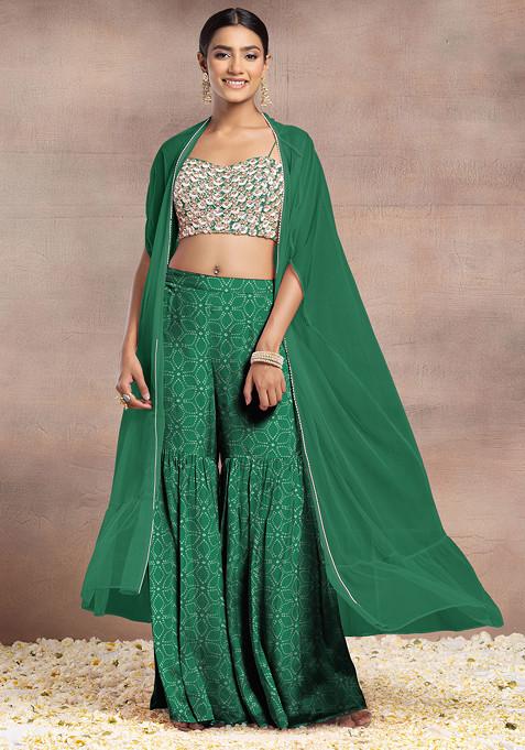 Green Sharara Set With Sequin Hand Embroidered Blouse And Mesh Jacket