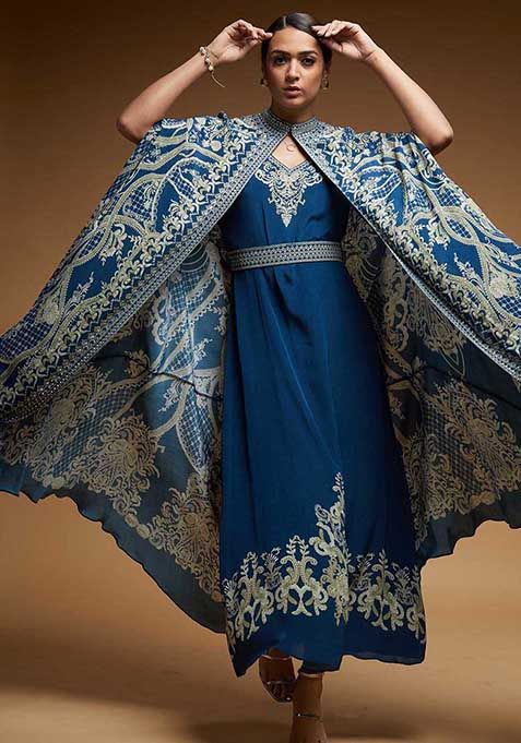 Navy Blue Embellished Jacket Set With Sequin Hand Embroidered Blouse And Palazzo