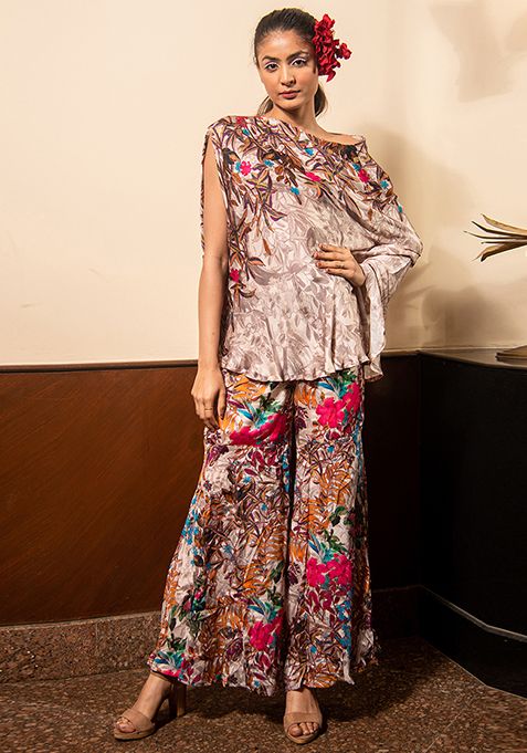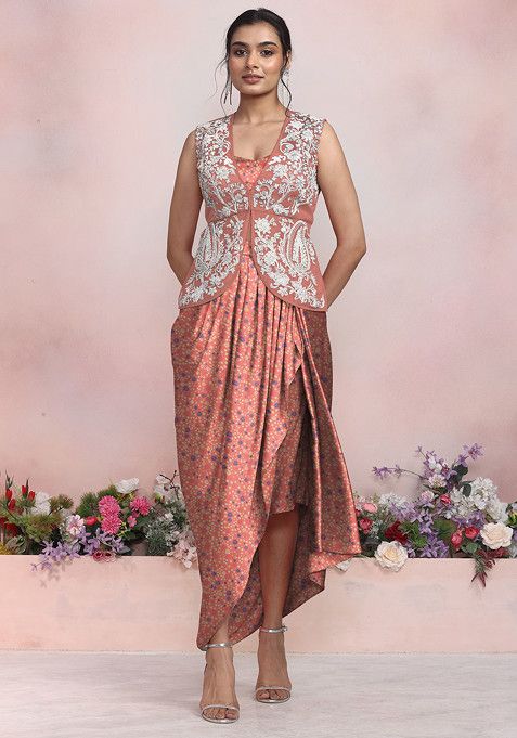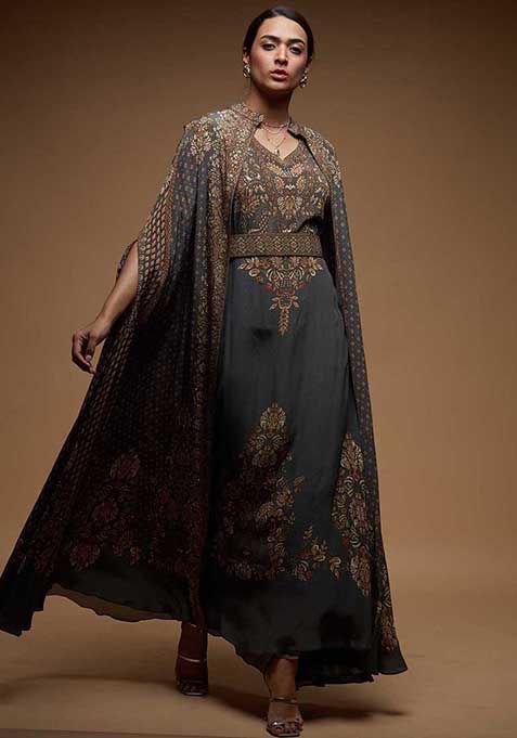 Grey Rhinestones Embroidered Bemberg Crepe Cape Set