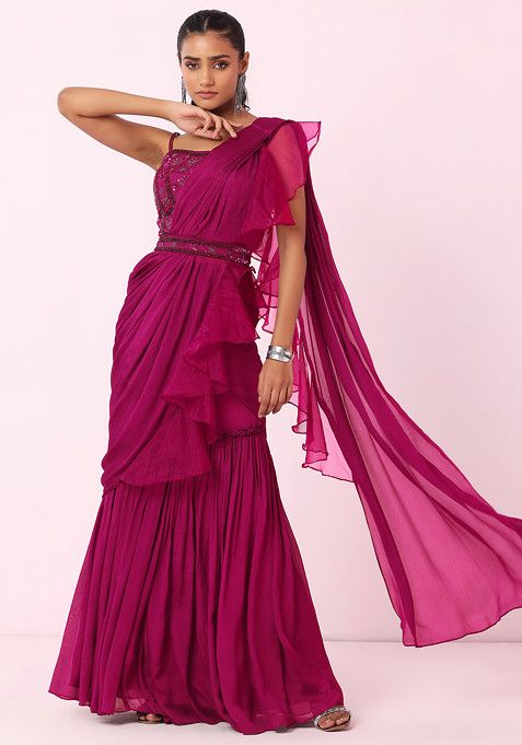 Pink Sharara And Hand Embellished Blouse Set With Attached Dupatta And Belt