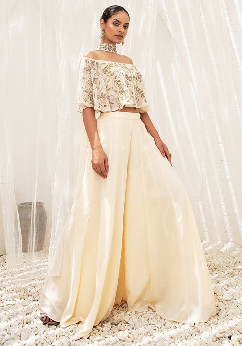 Ivory Sharara Set With Floral Bead Hand Embroidered Blouse And Choker Dupatta