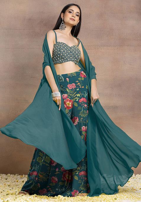 Dark Sea Green Sharara Set With Geometric Hand Embroidered Blouse And Jacket