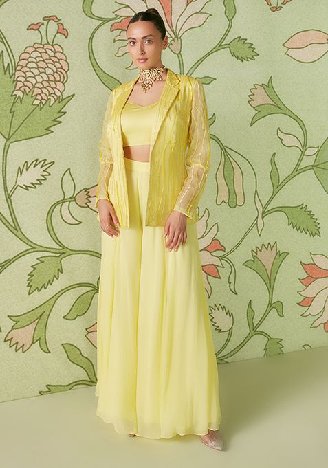 Light Blue Jacket Set With Sequin Bead Hand Embroidered Blouse And Palazzo