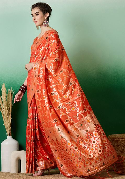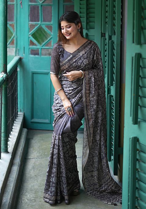 Grey Batik Print Embroidered Tussar Silk Saree Set