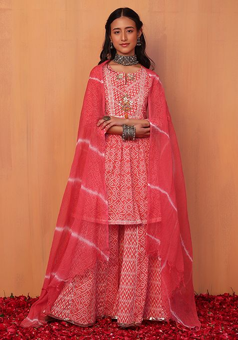 Peach Bandhani Print Cotton Short Anarkali Kurta With Sharara And Dupatta (Set of 3)