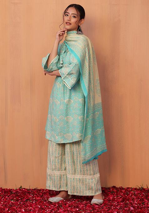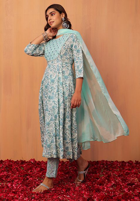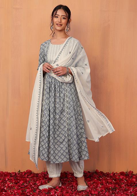 Blue Floral Jaal Print Muslin Anarkali Kurta With Pants And Dupatta (Set of 3)
