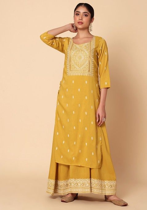 Mustard Yellow Foil Print Double Layered Muslin Kurta