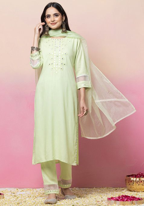 Pastel Green Thread Embroidered Rayon Kurta With Pants And Organza Dupatta (Set of 3)