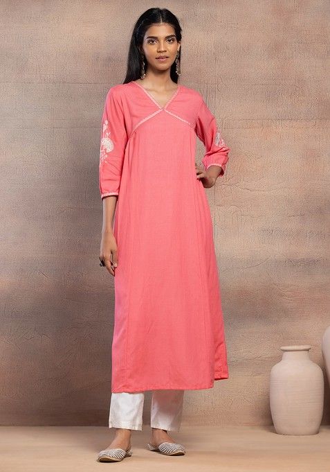 Pink Thread Embroidered V-Neck Cotton A-Line Kurta