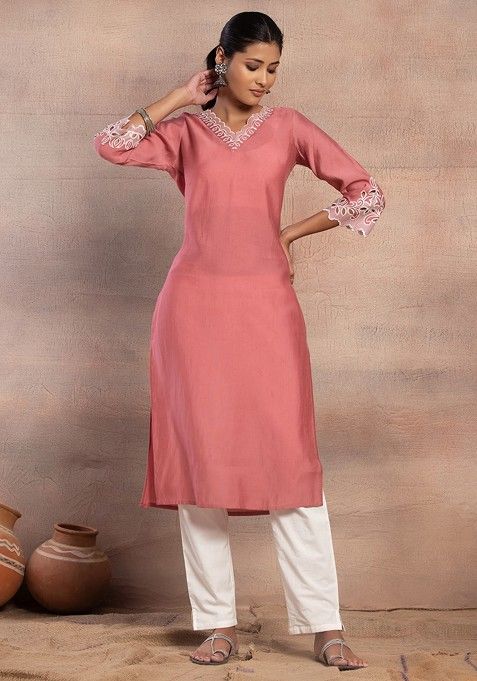 Pink Rayon Kurta With Pants And Dupatta (Set of 3)