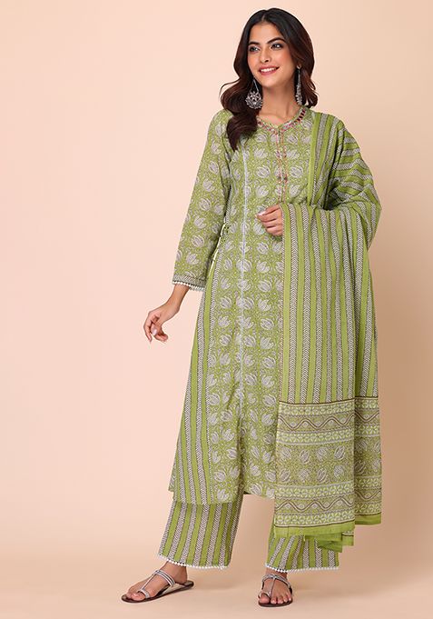 Green Cotton Kurta With Pants And Dupatta (Set of 3)