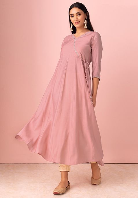 Light Pink Zari Embroidered Muslin Angrakha Kurta