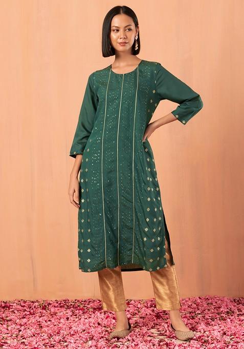 Dark Green Sequin And Thread Embroidered Muslin Kurta